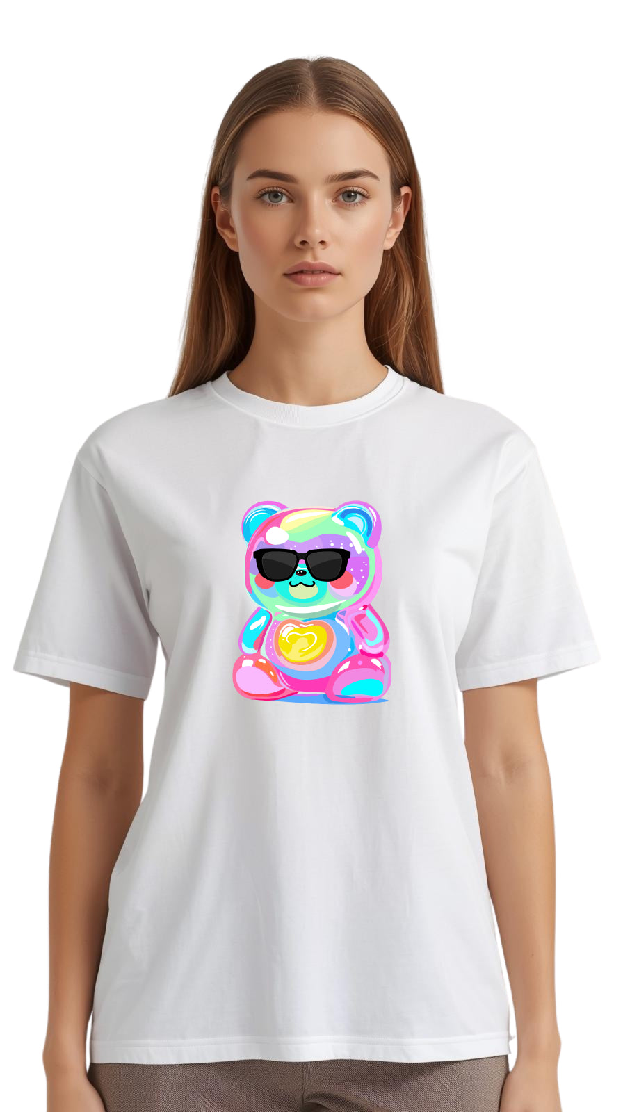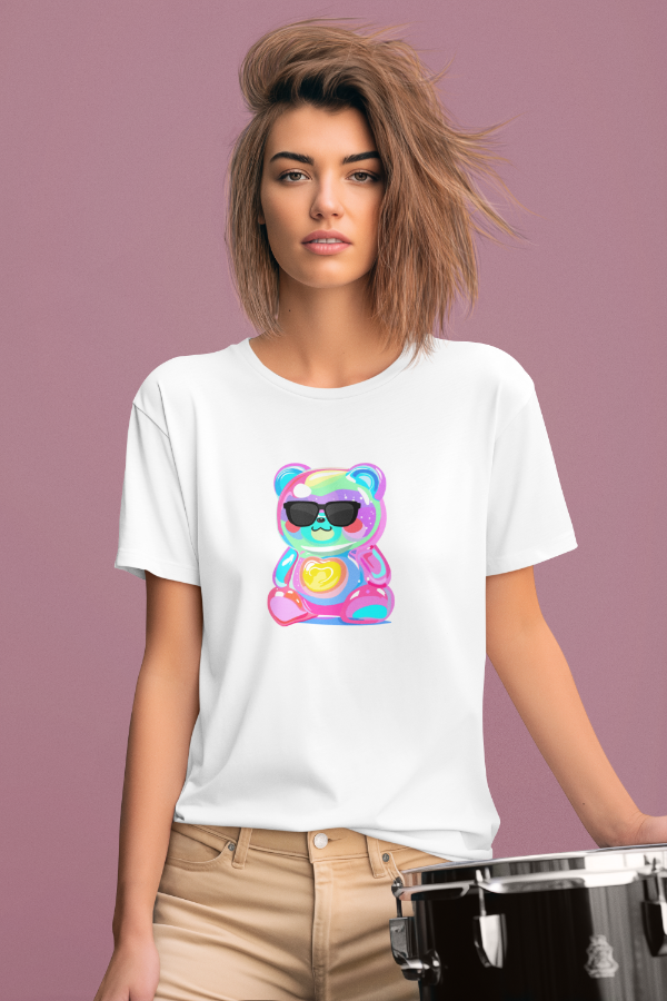 Add a pop of playful charm to your everyday look with this White Regular-Fit Women’s T-Shirt featuring a rainbow-colored teddy bear print on the chest. Crafted from soft, breathable cotton, this tee blends comfort with a touch of cute street style. The rainbow-colored teddy graphic stands out against the clean white base.