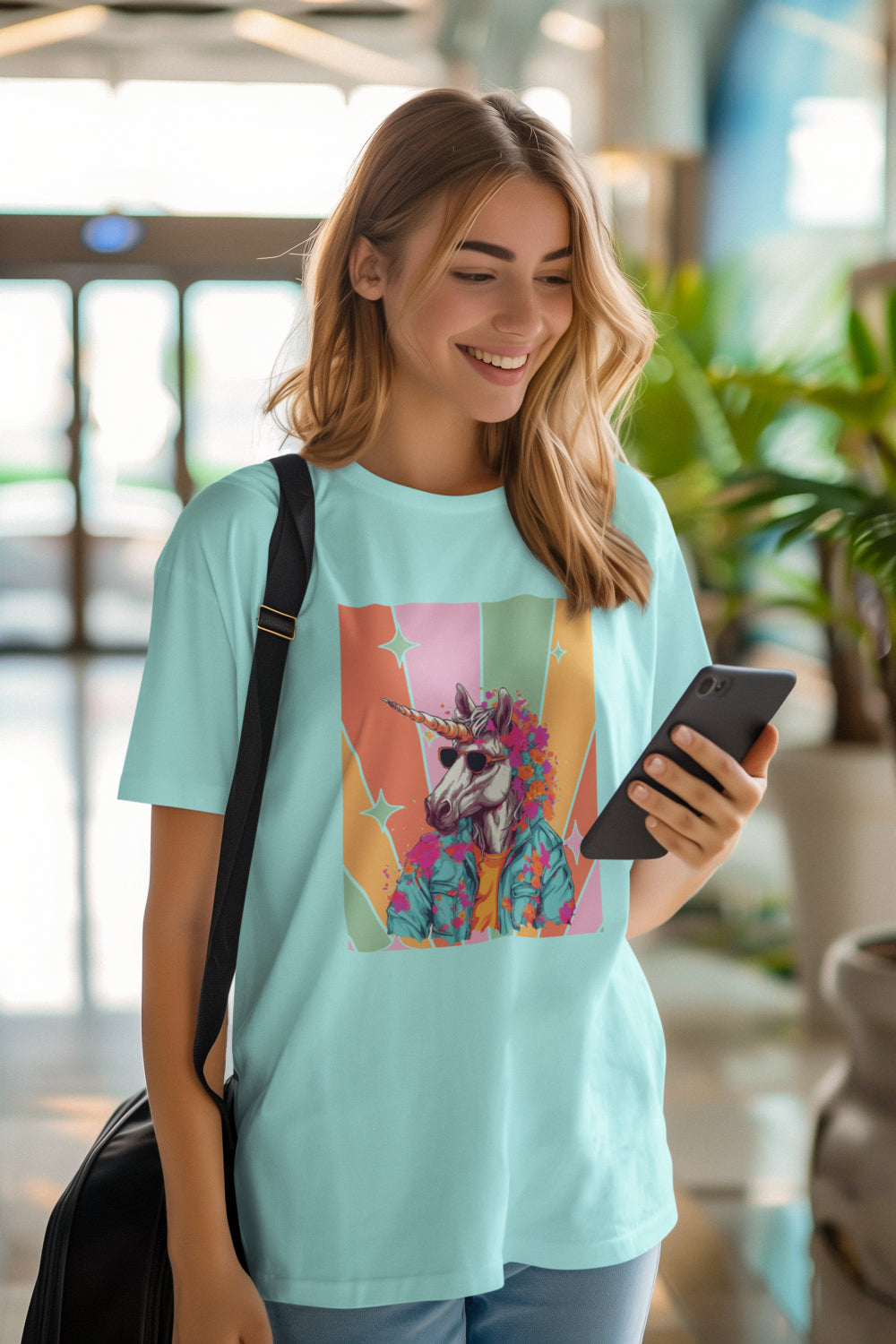 Embrace whimsy with our Women's Abstract Color Unicorn T-shirt, featuring a vibrant unicorn print on soft, breathable cotton. This oversized fit ensures all-day comfort and effortless style.
