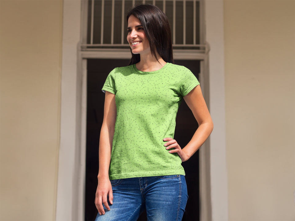 Experience comfort and style with our Women's Constellations Lime All Over Print T-Shirt. Featuring a vibrant, sublimation print, this tee offers a premium cotton feel and a unisex regular fit. Perfect for any casual outing, it ensures a soft touch and a perfect fit, making it a must-have